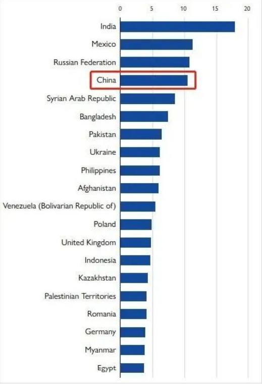 《世界移民报告2022》还对国际移民输出国进行了排序: 印度有近1800万人生活在国外,是全球移民国外人数最多的国家;墨西哥是第二大移民输出国,大约有1100万人;俄罗斯第三,大约有1080万人;中国是第四大移民输出国,约为1000万人。