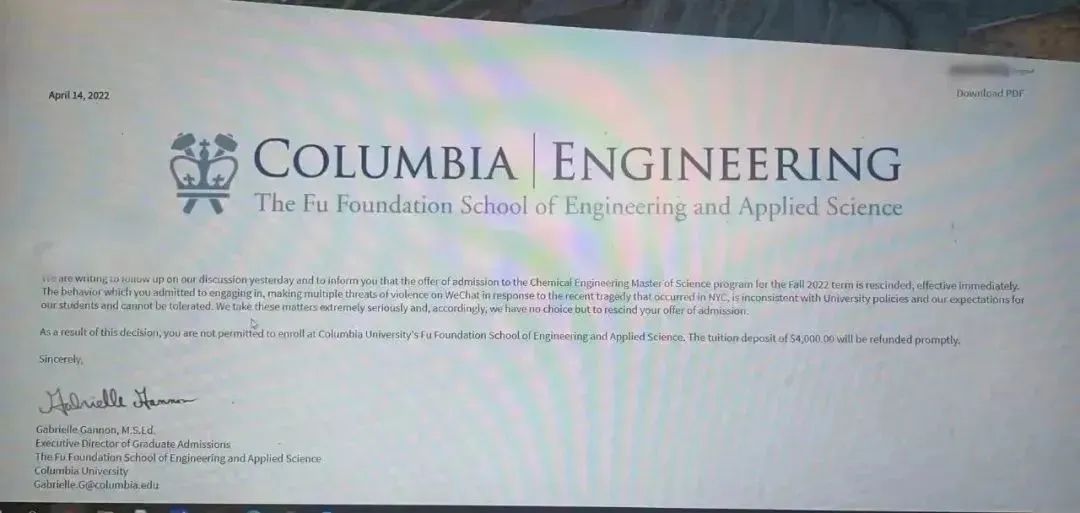 撤销录取的决定书说,撤销这名学生2022年秋季被化工系录取为研究生的通知书,是因为这名学生承认了他在微信上,针对最近纽约市发生的不幸,多次发出暴力威胁的言论,不符合哥大的政策及该校对学生的期望,无法容忍。