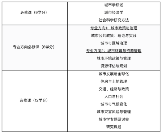 城市学硕士学生需完成3门必修课程、2门专业方向必修课程和4门选修课程,至少27学分方能毕业,以下所列课程均为3学分。