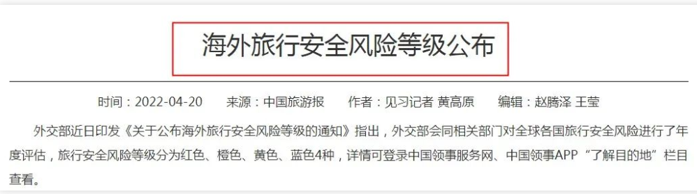 近日,中国外交部印发《关于公布海外旅行安全风险等级的通知》,对全球各国的旅行风险进行了评估,旅行安全风险等级分为红色、橙色、黄色和蓝色四种。