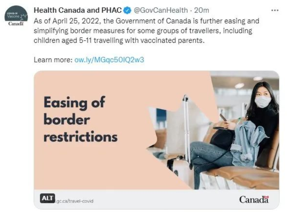 另外一边,加拿大也于今天传来了一个好消息,让出入境变得更加方便。据多家英文媒体综合报道,加拿大政府近日宣布进一步放宽入境的限制,未接种新冠疫苗和部分接种疫苗的5至11岁儿童在入境加拿大时,不再需要COVID-19检测。联邦政府周五表示,从东部时间4月25日周一凌晨1点开始,在已接种疫苗的父母、继父母、监护人或导师的陪伴下,5至11岁年龄组的儿童将不需要完成入境前的COVID-19检测。