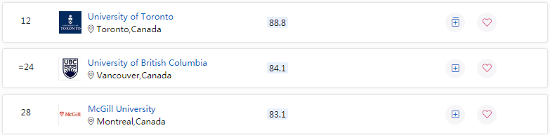 在生命科学与医学学科中,加拿大top3院校位列世界前30。