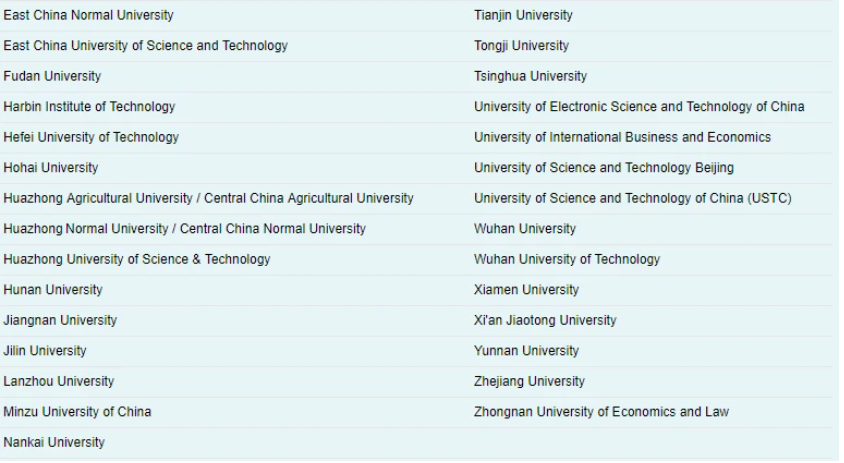 安徽大学、北京工业大学、北京体育大学、大连海事大学、第四军医大学、东北农业大学、福州大学、广西大学、贵州大学、国防科技大学、海南大学、合肥工业大学、河北工业大学、湖南师范大学、华南师范大学、暨南大学、辽宁大学、南昌大学、南京航空航天大学、南京师范大学、内蒙古大学、宁夏大学、青海大学、陕西师范大学、上海大学、石河子大学、四川农业大学、苏州大学、太原理工大学、天津医科大学、西安电子科技大学、西北农林科技大学、西藏大学、新疆大学、延边大学、郑州大学