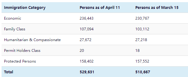截至4月11日,永久居民申请积压量为53万人,比3月份的51.9万人略有增加。所有类别的永久居民申请积压量都有所增加。
