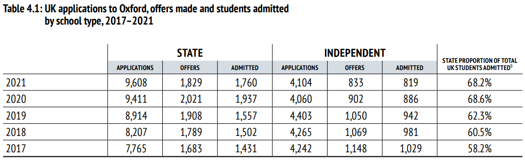 2021入学,牛津录取的公立学生占比 68.2% ,与去年基本持平,均属于历史最高水平行列。