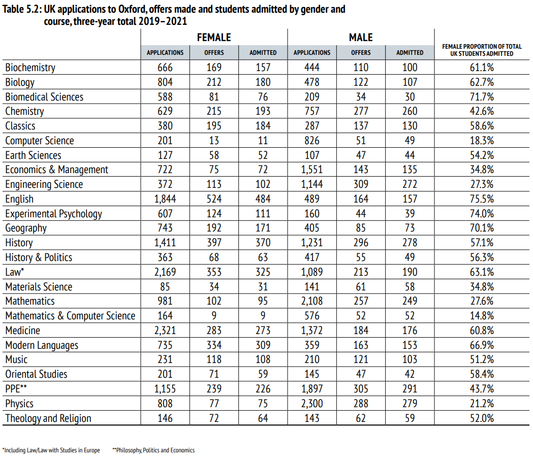 女生比例继续上涨,达到55.2%(去年数据54.2%) 。从2018年到2021年,牛津大学每年录取的本科女生都多于男生。
