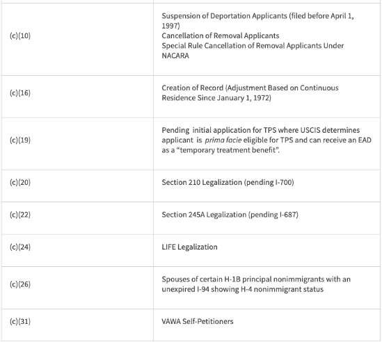 以下截图表格里包括了 原本就有自动延期资格的工卡类别 ,如果你的工卡类别不在以下范围内,就不能享受新政策福利。一般留学生常用的STEM专业OPT延期并不在适用范围内。