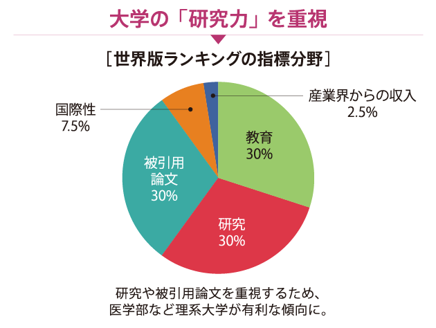 日本版排名指数由“教育资源”、“教育充实度”、“教育成果”、“国际化”四个领域组成。具体比例如下:教育资源→34%教育充实度→30%教育成就→16%国际性→20%