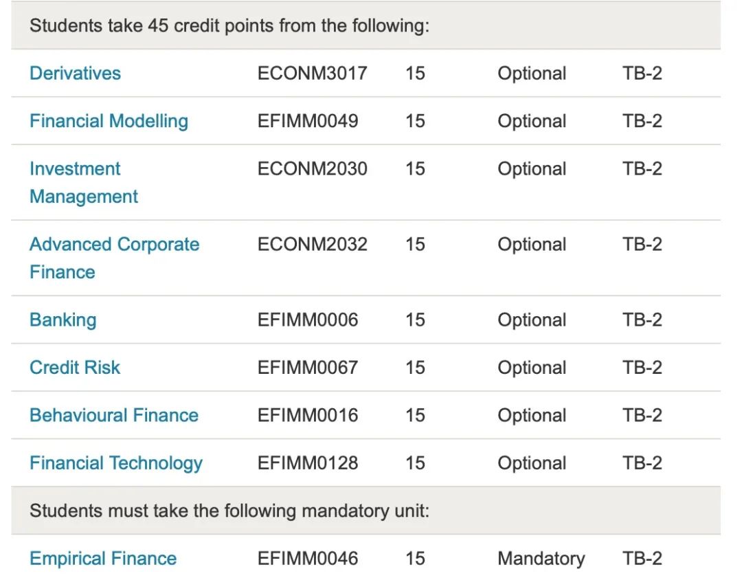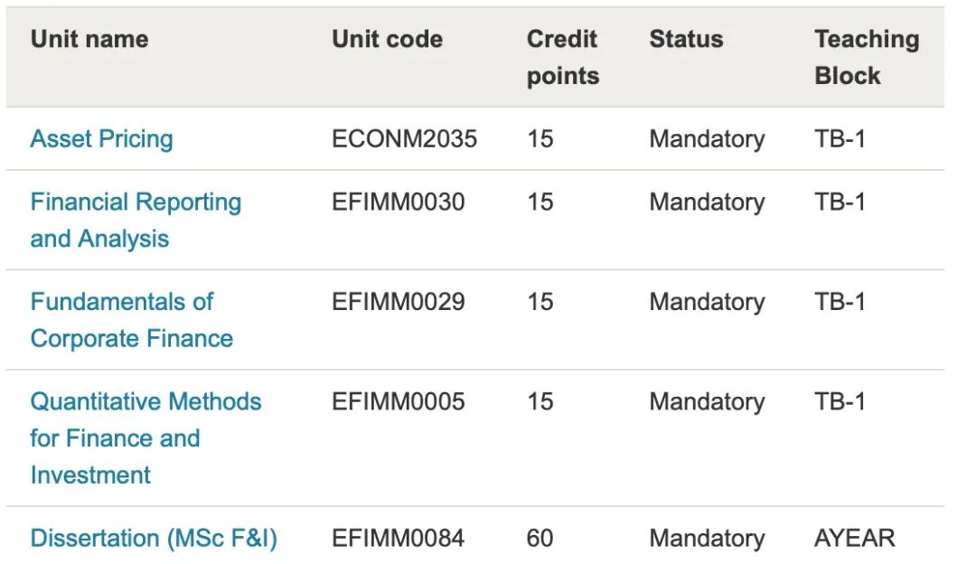 MSc Finance an Investment的课程覆盖面广、实用性高,包含资产定价、企业金融、金融投资方法,以及提升实践能力的实证金融等核心课程课程。同时,学生可以根据自身职业发展需求选择感兴趣的选修课程。
