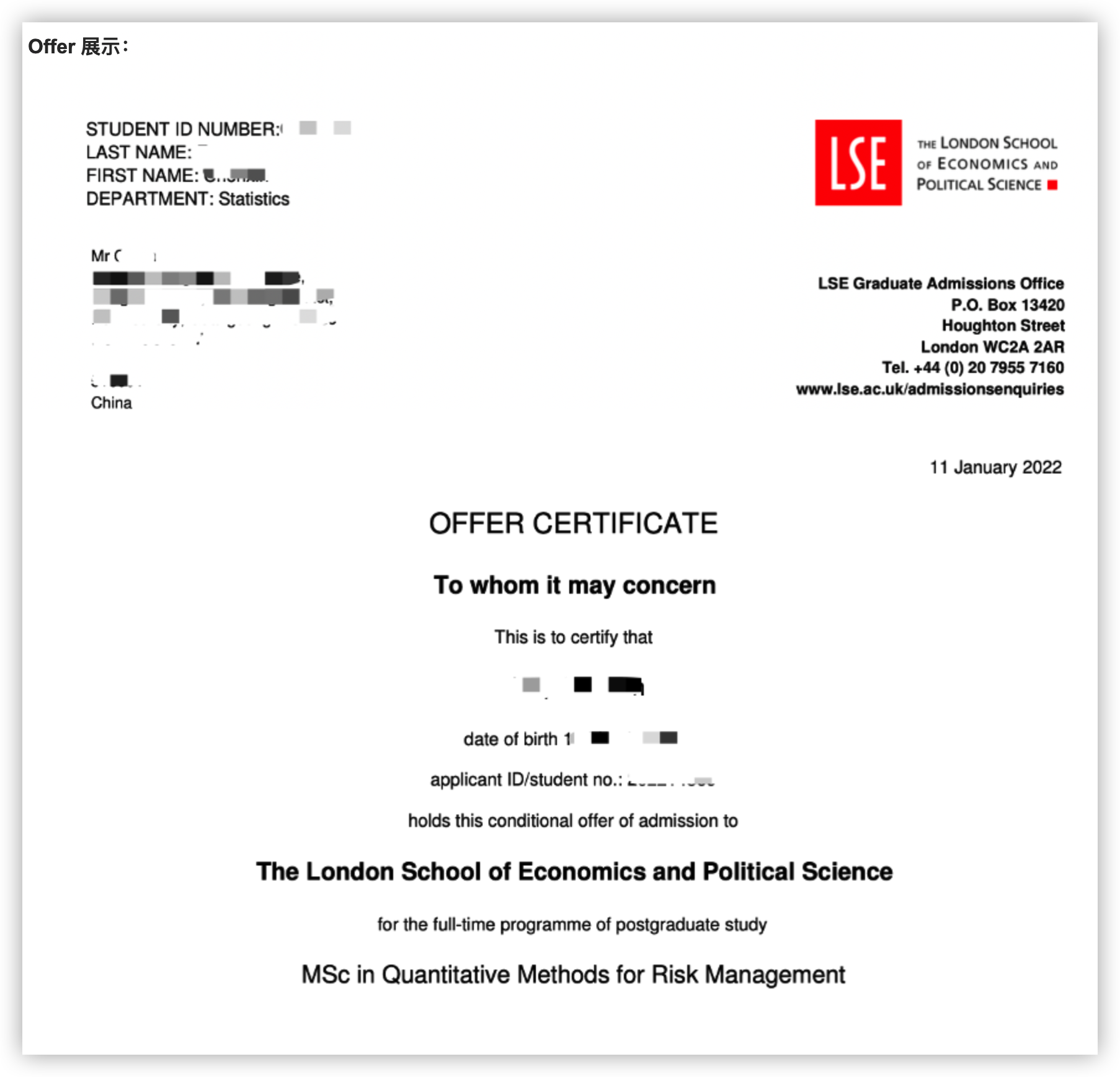 学生本科是国内 211 财经院校,大一开始坚定了留学目标便开始规划留学申请,我们制定了完整的学期中 + 假期学习和实践计划,时间充裕,因此有充足的时间来达成各项标化成绩、软实力背景。