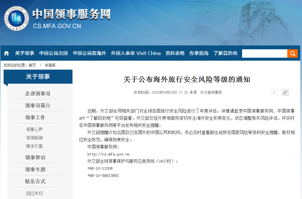 截止到2022年4月20日,中国外交部给各国的旅行风险评级如下: