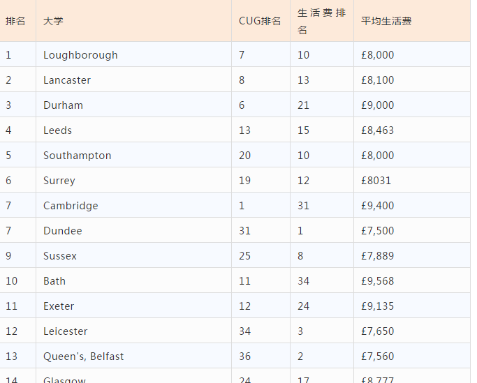 兰卡斯特和杜伦大学,生活费平均为8100和9000英镑,榜单中排在第二、三名,然而 CUG 排名只在第8和第6.