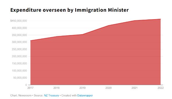 然而和 “人手短缺” 相对应的,却是移民局的 “增员” 和 “支出上升” 。 根据公开信息, 在过去的五年里,新西兰移民局的工作人员数量增加了 三分之一 ( 约500人,从1357到1879 ),开支增加了 50% (从 3.12亿 增加至 4.62亿 )。