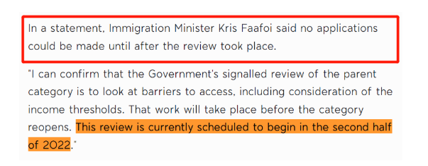 声明提到,“我可以确认,政府对父母类别的重审是为了研究准入门槛,包括收入门槛。这项工作将在该类别重新开放之前进行。政策审查目前计划2022年下半年开始。”