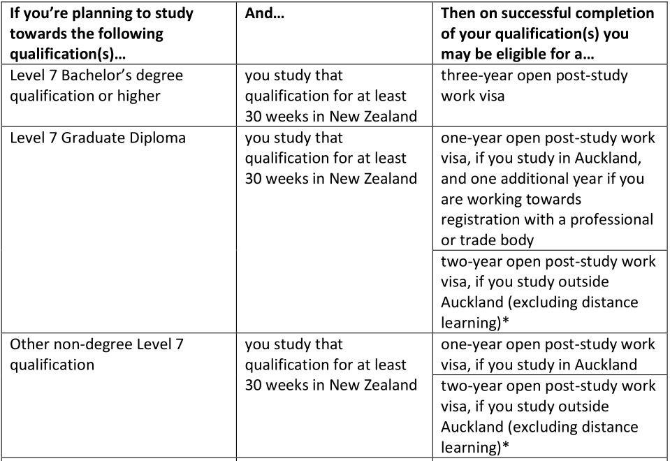 假如你进修 7级研究生文凭 课 程,且在 奥克兰 地区学习,你将获得 1年open工签 。如果所学专业需要 职业注册 ,你将获得 额外1年 的open工签。同等条件下,在 奥克兰以外 地区进修的留学生,将获得 2年open工签 。