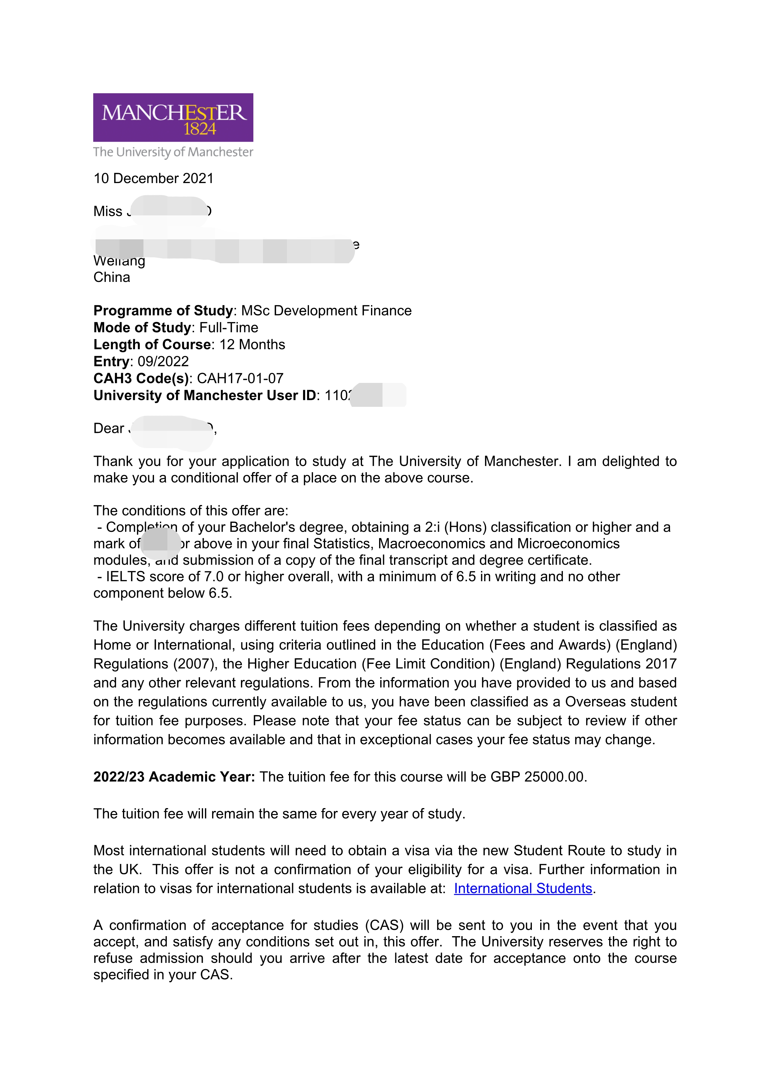 学生本科背景不错,均分很高,同时雅思分数也不错。英国的商科申请竞争越来越激烈,很多申请者在提前规划留学的时候,就已经早早的考出了合格雅思,这样在申请时也能面对更大竞争与挑战。学生也是通过熟人介绍,远程未见面办理留学。我们也是帮学生做了分析,在本科院校背景匹配的情况下,规划了世界前50左右的大学申请范围,专业方面也是选择了跟学生本科专业差不多的金融类。学生除了雅思之外,之前也参与了几项实习,并且也有很多的奖状,在等待了2个多月之后收获了学生心仪的大学录取。给目前在规划留学的申请人很真实的建议,国内卷的同时,国外也很卷,留学一定要趁早。