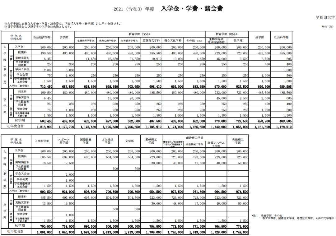 政治経済学部、法学部、文化構想学部、文学部、教育学部、商学部、基幹理工学部、創造理工学部、先進理工学部、人間科学部、スポーツ科学部、国際教養学部、社会科学部