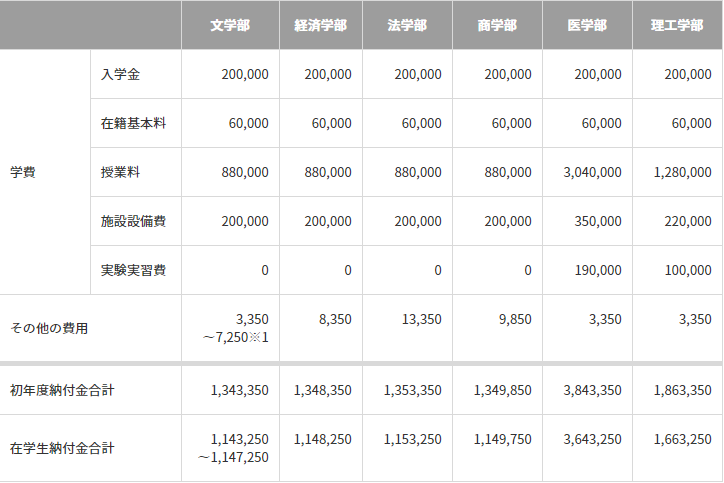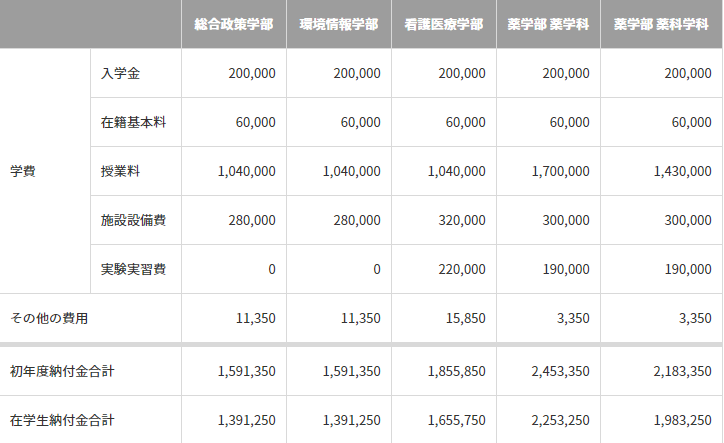 文学部、経済学部、法学部、商学部、医学部、理工学部、総合政策学部、環境情報学部、看護医療学部、薬学部