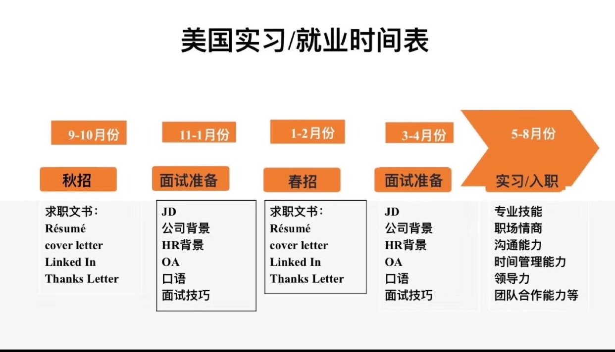 据教育部留学服务中心2017年数据显示,近半数归国留学生没有工作经验。然而就用人单位而言,更希望录用有工作经验的求职者。因此,留学期间的实习经历就变得很重要。不得不承认,找到好的实习,进而去到有竞争力的工作岗位,是小僧们的一致愿望。毕竟在美国学习之余找到实习锻炼自己的专业技能,提升软实力背景,小僧们对于实习的热情不减,但最终得到实习的机会确实很渺茫。找工作找实习在很多小僧看来都是可遇不可求之事,或者小僧们在毕业之际才明白这些道理,但为时已晚,遗憾不已呀!下面来了解一下要想找到实习或者就业,什么时候该做好哪些准备吧!
