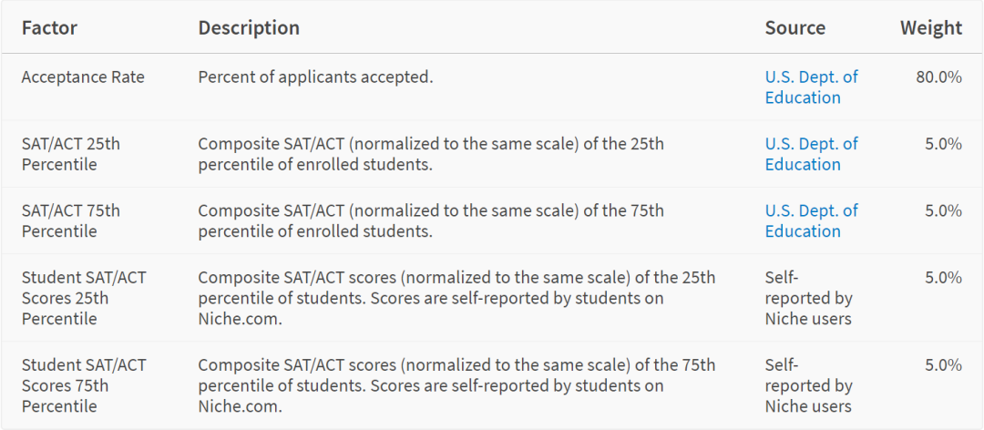 Niche排名不仅结合了学术、招生、财务和学生生活等数十种公共数据,更重要的是结合了一众学生家长的意见做参考,可以称得上是一份大学满意度排行榜。 本次Niche排名主要基于美国各大高校公布的最新录取率、SAT/ACT考试成绩,以及美国教育部的数据统计而成。在今年的排名中,Niche降低了ACT/SAT分数的权重,以应对美国大学在录取过程中普遍不再重视考试分数的变化,同时把录取率的权重从60%升至80%!