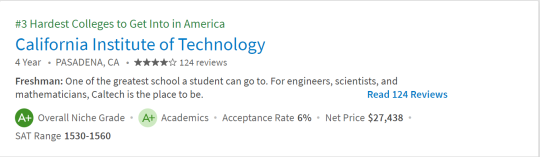 录取率:6% SAT范围:1530-1560 ACT范围:35-36 师生比:1:3 最受欢迎的专业:计算机科学、机械工程、电气工程 毕业6年后的平均收入:85,900美元/年