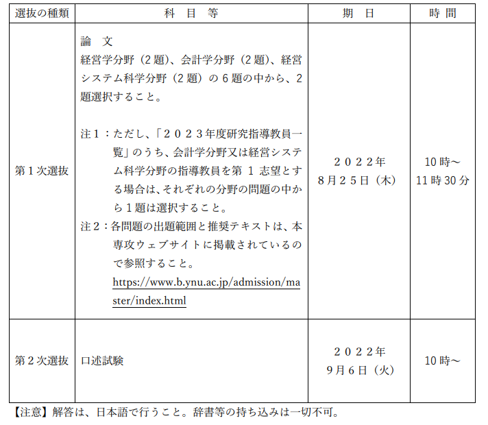 横滨国立大学今年的一般入试依旧采用笔试+面试的形式。笔试的时间是2022年8月25日,考试内容为6选2的小论文(经营学、会计学和经营系统三个分野各两题,一共六题)。如果志望教授的所属分野为会計学或経営系统的话,至少需要回答一道对应分野的题。