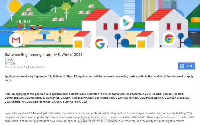 谷歌现面向在攻读计算机科学等计算机领域的本科生、研究生开放软件工程实习岗位,12-14周带薪实习,实习地点:Mountain View,Bouler,Cambrige,Chicago,Irvine,Kirklan,Los Angeles,New York,Pittsburgh,San Bruno,Seattle,San Francisco,Sunnyvale。有数据结构与算法经验(包括校内外实践、个人项目、课程项目等),有使用C、C++、Java、JavaScript、Python软件开发经验。