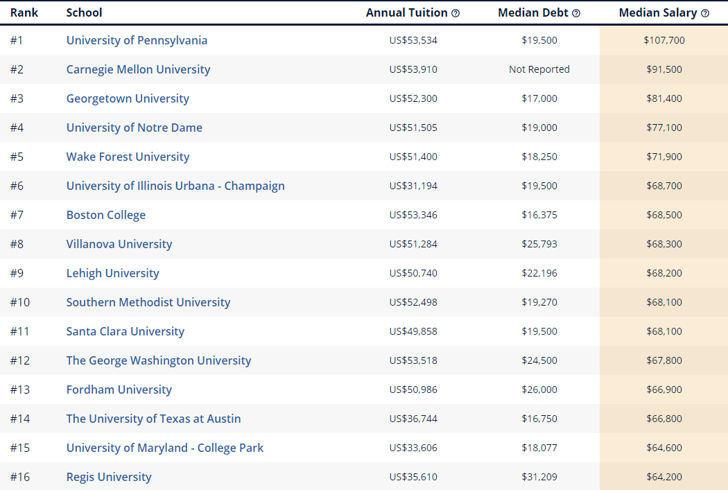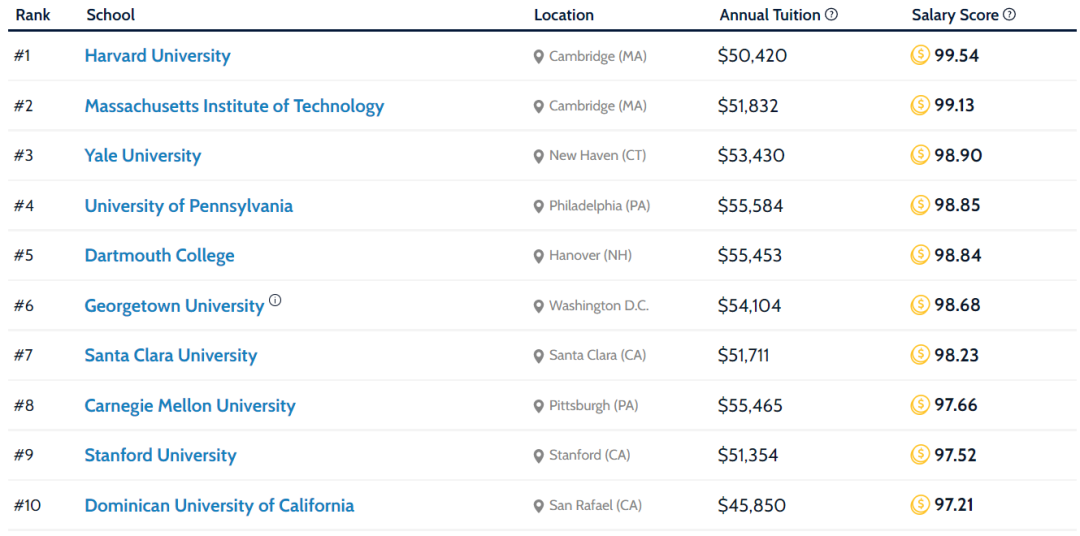结果显示,本次排名前十的学校分别是:哈佛大学、麻省理工学院、耶鲁大学、宾夕法尼亚大学、达特茅斯学院、乔治城大学、圣克拉拉大学、卡内基梅隆大学、斯坦福大学和加州多明尼克大学。