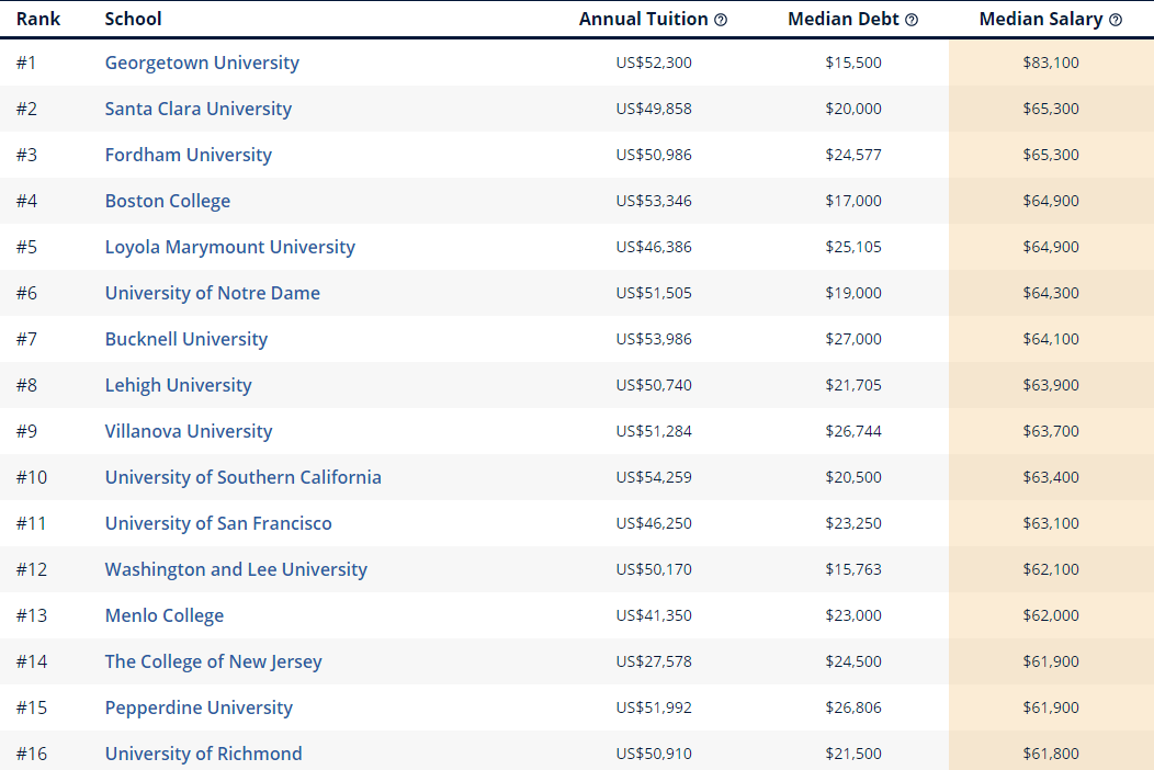 本科毕业一年后,会计专业毕业生的起薪中位数在60,900-65,300美元之间。乔治城大学除外,起薪高达83,100美元,薪资水平最高的前三是: