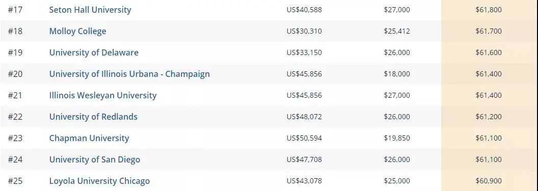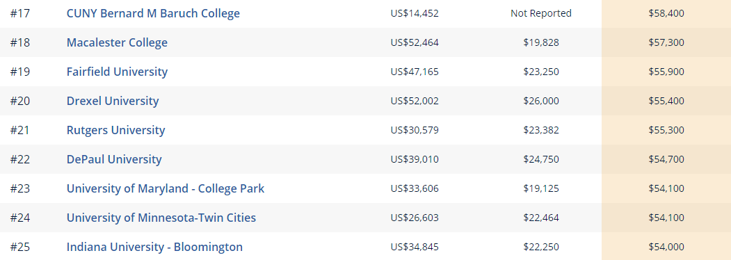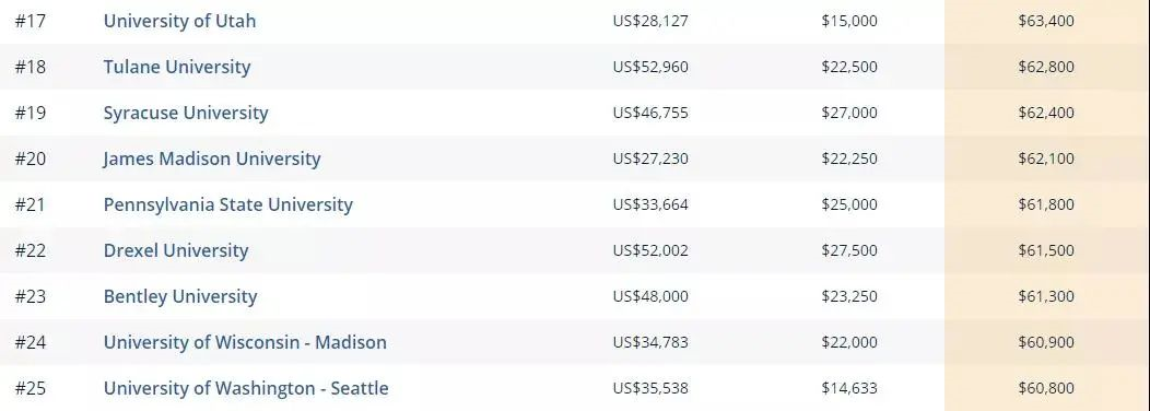 在本科金融学专业排名前25的学校中,起薪中位数在60,800-107,700美元之间。排名前三的学校分别是: