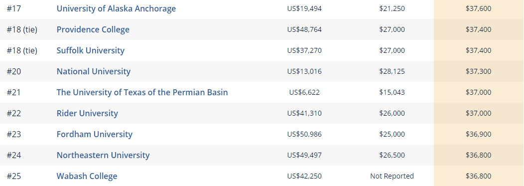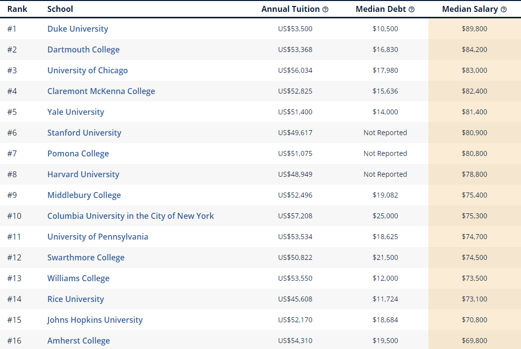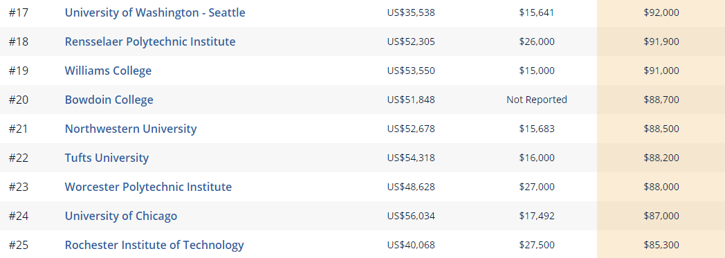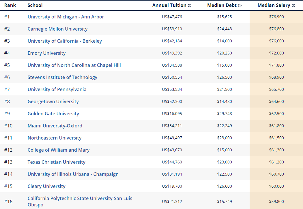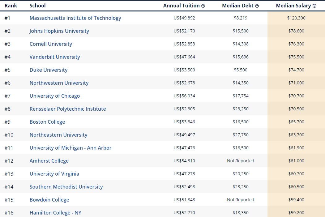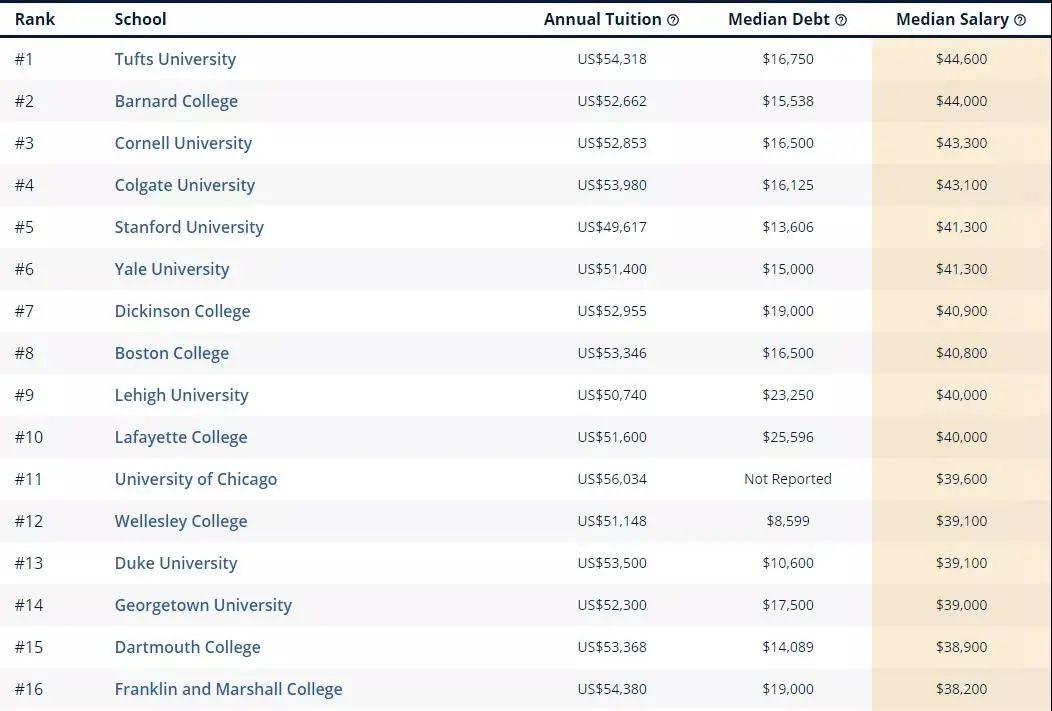 为帮助大家能更好的确定选校和专业,GraReports.com根据美国教育部College Scorecar网站最新发布的,基于900多所学校,100,000多个大学学位课程和超过500万毕业生的起薪数据,最终确定了各个大学薪资排名,及各个专业学位下的院校起薪排名。