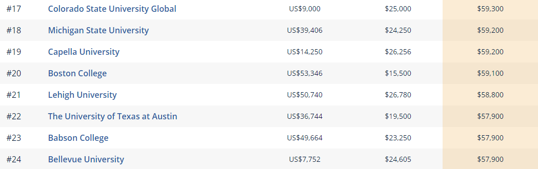 可以看到,很多综合排名一般的学校在某些专业就业方面甚至比那些顶尖学校表现还要好。而同一所学校不同专业毕业生的起薪也相差不少。所以,想要毕业后拿到不错的起薪,专业和学校的确定都至关重要!