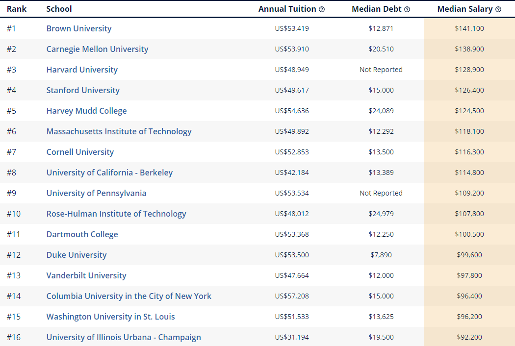 专业排名方面,STEM领域的薪资在所有专业中都名列前茅。其中,布朗大学的计算机科学学士学位毕业生的起薪最高,为141,100美元。