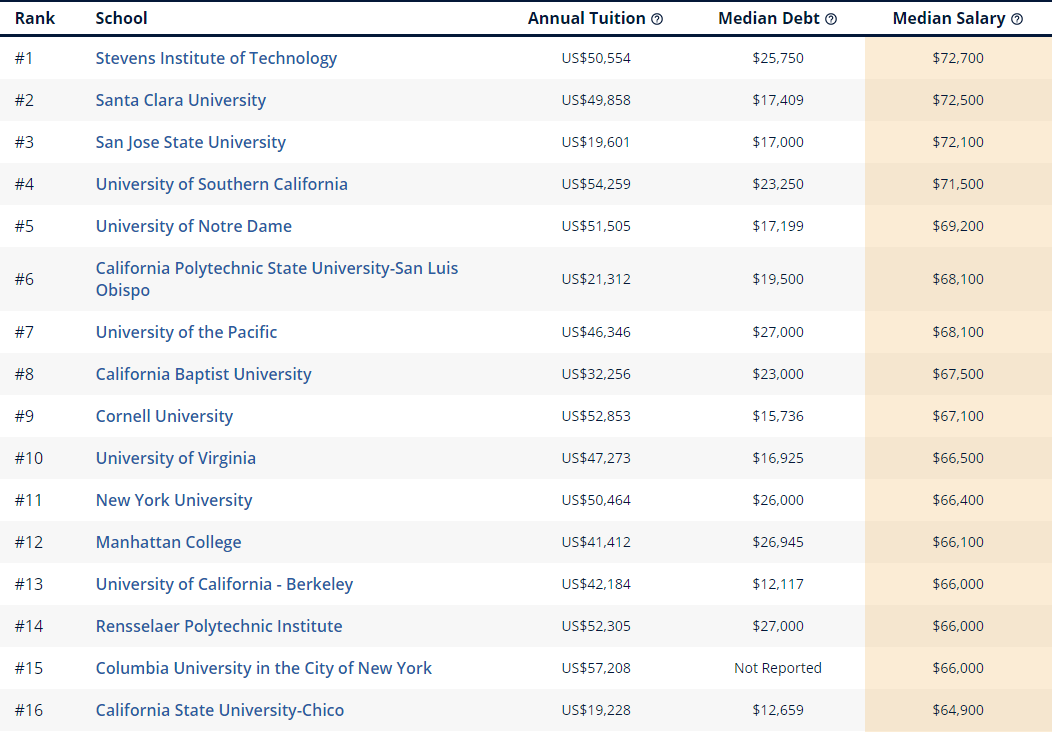 从学校的方面来看,在很多专业中,次尖学校的表现甚至比顶尖大学的还要好。例如,土木工程专业中,收入最高的三所学校分别是史蒂文斯理工学院($ 72,700)、圣塔克拉拉大学($ 72,500)和圣何塞州立大学($ 72,100)。相比之下,圣母大学($ 69,200)、康奈尔大学($ 67,100)和哥伦比亚大学($ 66,000)都略逊一筹。