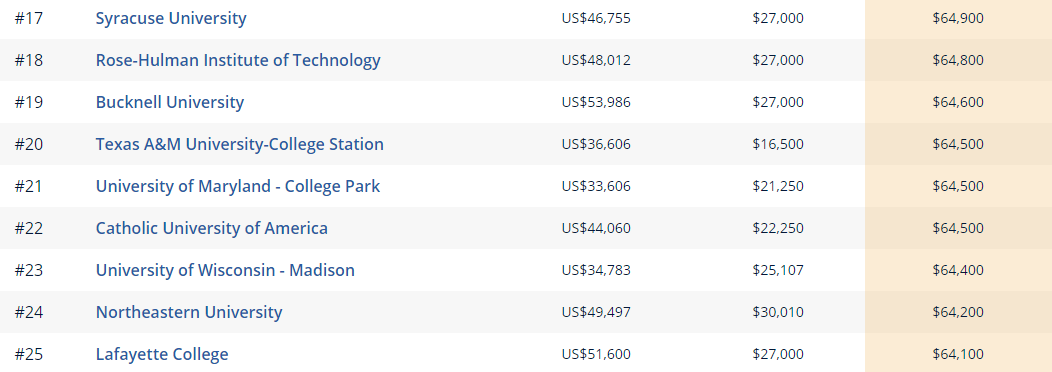 在本科土木工程专业排名靠前的25所学校中,起薪中位数在64,100-72,700美元之间。薪资水平最高的三所学校是: