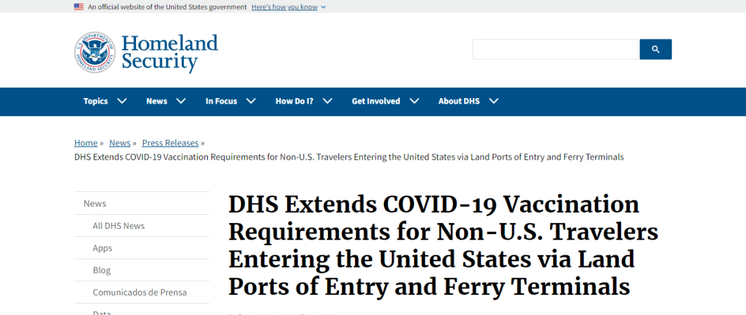 美国国土安全部近日表示,将大幅调整海关的防疫规定,从陆地和海上进入美国需要出示疫苗证明。