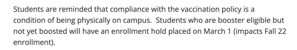 对疫苗加强针提出了明确的要求,如果没有注射疫苗,将会影响2022年秋季学期的入学。