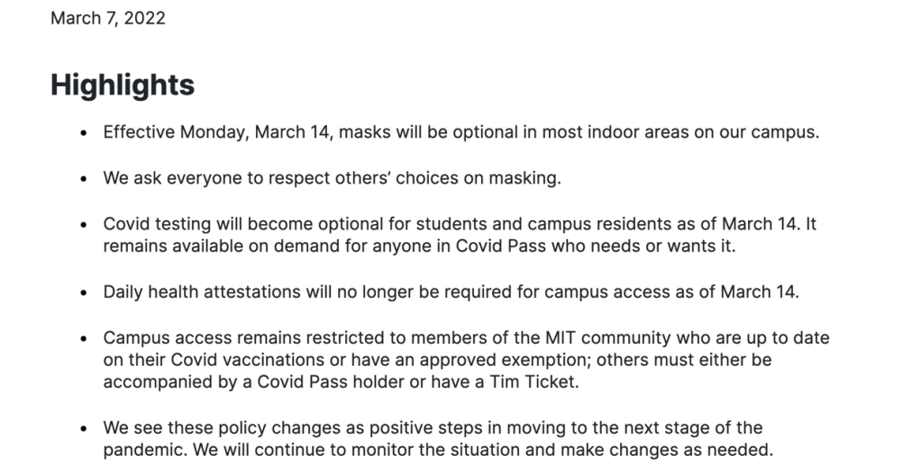从3月14日开始防疫政策被进一步放宽。学生可以自主选择是否需要戴口罩以及进行核酸检测,进入校园也不再需要每日健康证明。