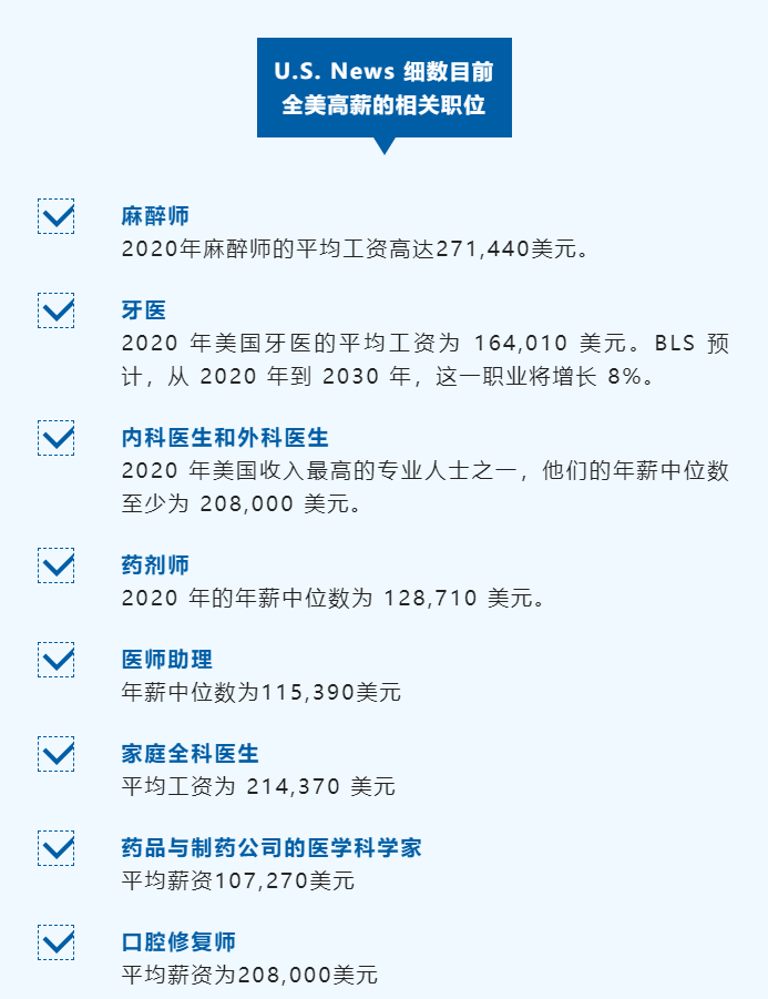 U.S. News & Worl Report针对全美热门的高薪行业数据进行了分析,发现高薪职位往往紧扣着未来行业发展的趋势。把握当前趋势与行业风口,将在起步时就帮助到国际学生的未来职业成功!
