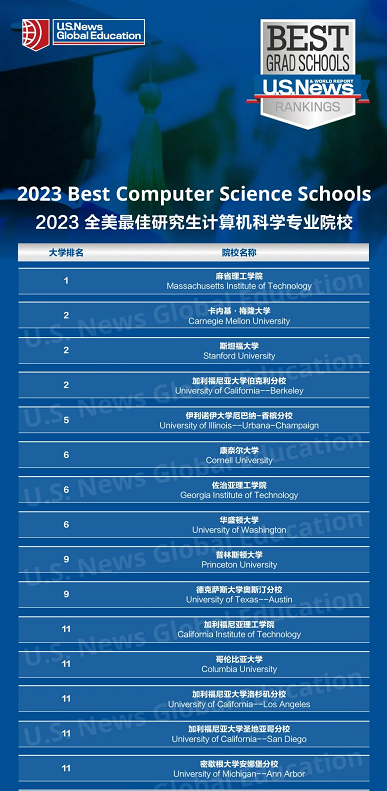 选择相应专业的院校,可参考最新发布的U.S. News & Worl Report 2023 全美最佳研究生院校排名的计算机科学排名,以及更多细分专业排名作为参考。