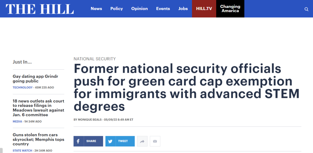 5月9日,美国《国会山报》消息,数十名前参议员、来自国防、能源和国土安全部的官员,以及中央情报局(CIA)、国家安全局(National Security Agency)和国防高级研究计划署(Defense Avance Research Projects Agency)等机构的前领导人共同致信国会,要求允许拥有STEM学位的移民不受绿卡配额限制。