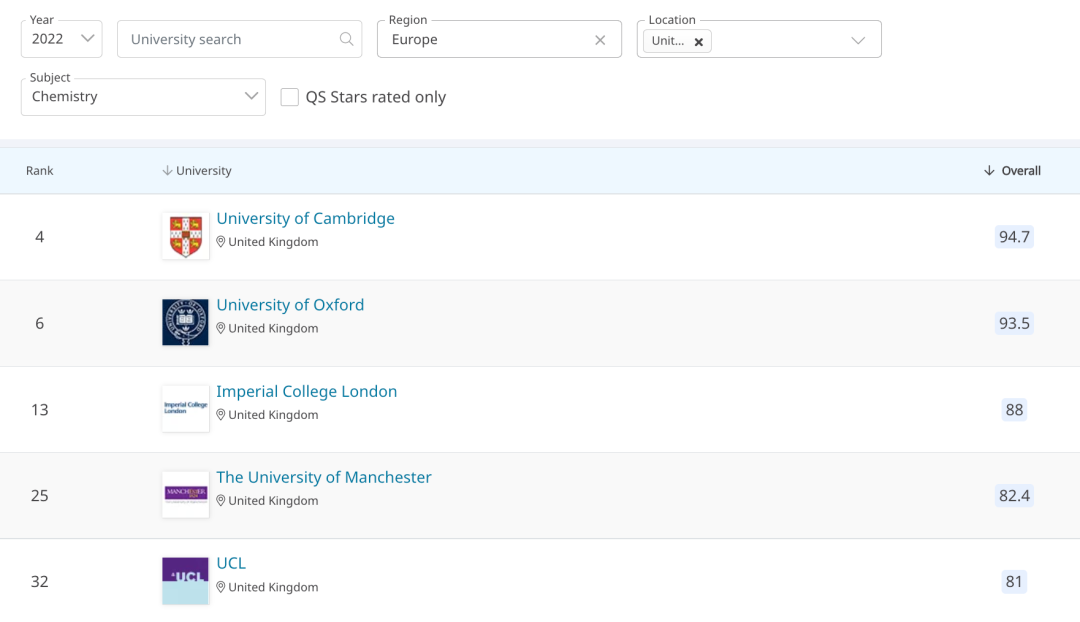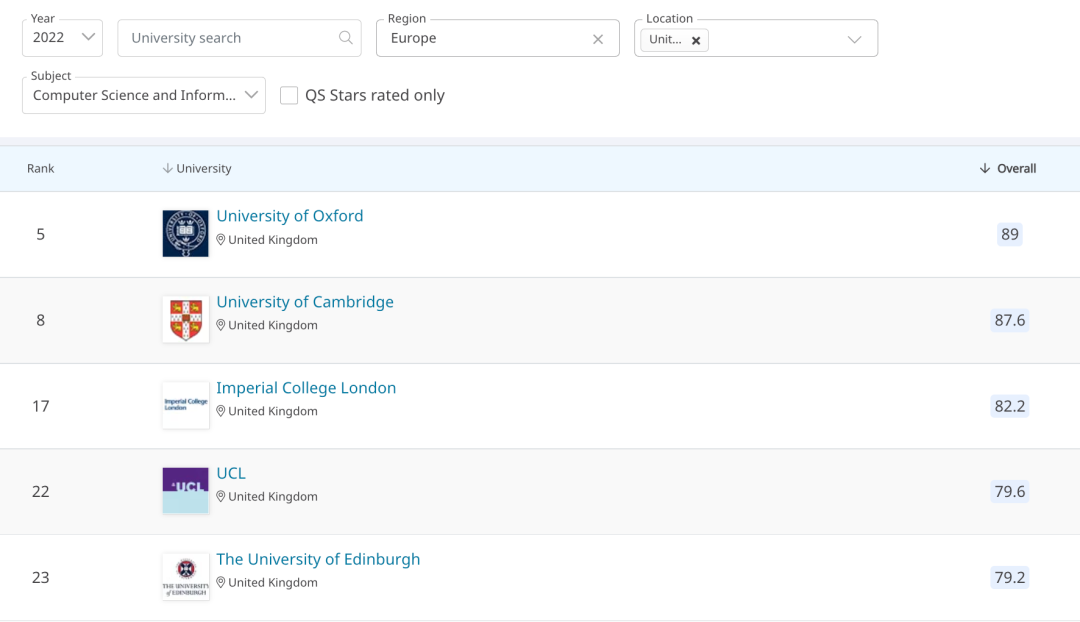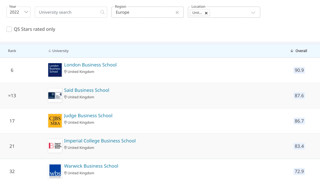 下图为2022年QS MBA专业排名英国Top5: