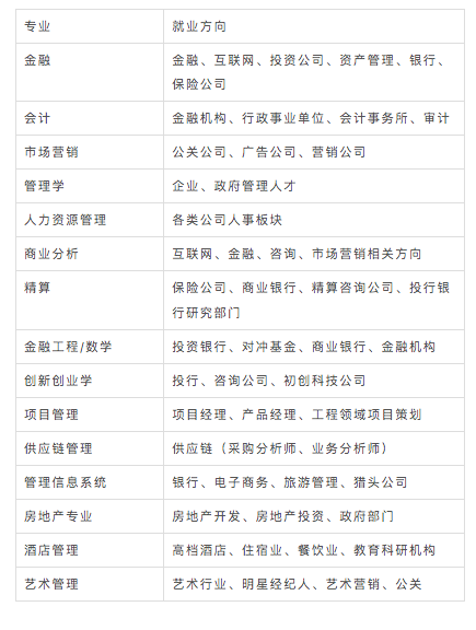 ·职能方向:营销、金融、会计、人力资源管理等“传统商科”专业