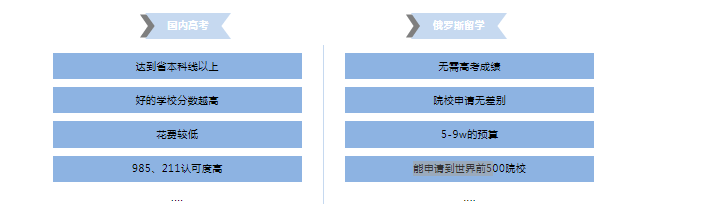 给大家分享下国内高考与俄罗斯留学的对比。高考是千军万马过独木桥,而大学,是我们未来工作的敲门砖,如果您在国内成绩不是特别理想的话,那么我更推荐您来俄罗斯留学,而不是选择将就,去到一个不是特别喜欢的学校因为入学门槛低,学费也不高,而且学校知名度高。但若是你在国内能够考上211或者985的名校的本科的话,国内就读的意义相对会更大一些,究其原因就是,你若是后续在我们国内就业,那对于院校的承认度来说,211,985的名头还非常认可的,你可以在硕士阶段考虑深造的事情。