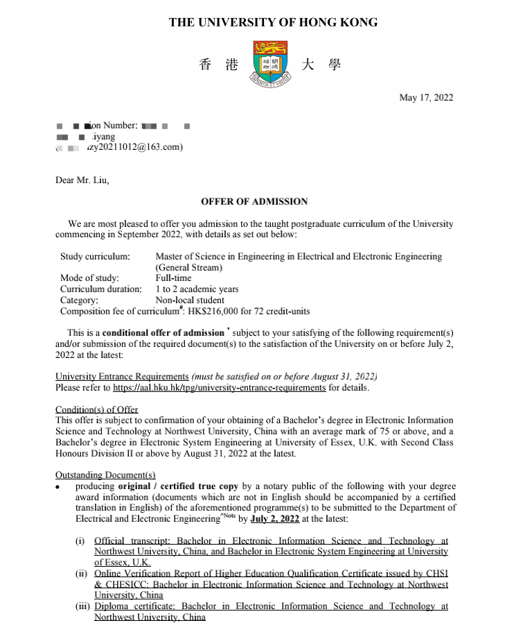 学生本科是211院校,平均绩点也不错,除此外就没有其它突出或亮点的地方,由于学生大三上学期,有一年的时间准备,于是我们目标锁定香港大学,根据往年的录取案例及学生自身的情况,帮助学生进行了专业的留学准备规划,过程中学生和家长也非常积极的配合,最终学生不仅有7分加的雅思成绩,还有非常高等级的论文发表,同时也有丰富的科研经历;给了我们文案老师丰富的文书素材,经过文书老师专业的文书制作,我们第一批递交了香港前三的申请,12月份就收到了香港中文大学的录取,最后在经历漫长7个月的等待后,学生如愿收到的香港大学的录取。