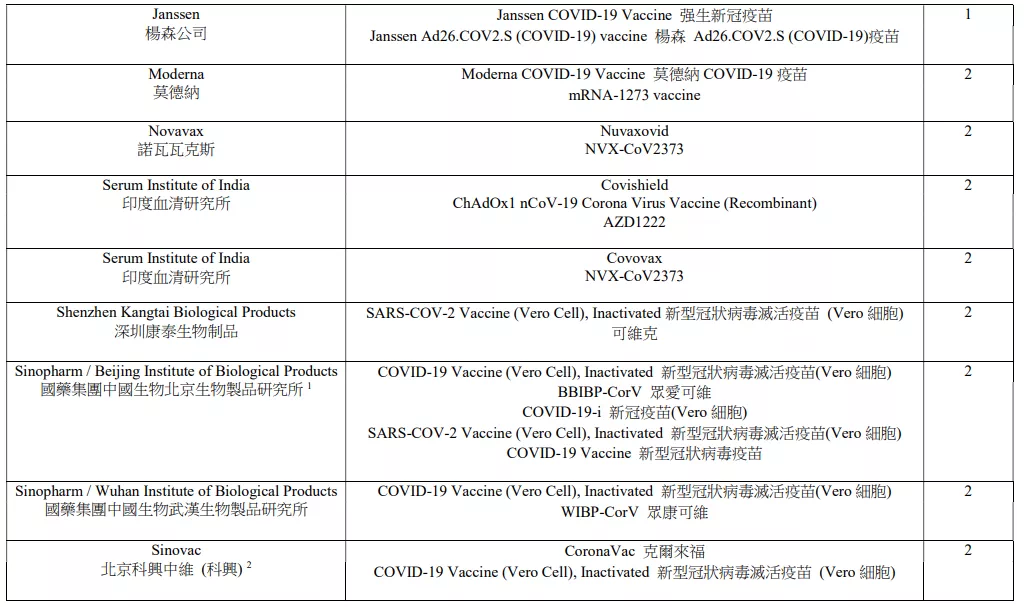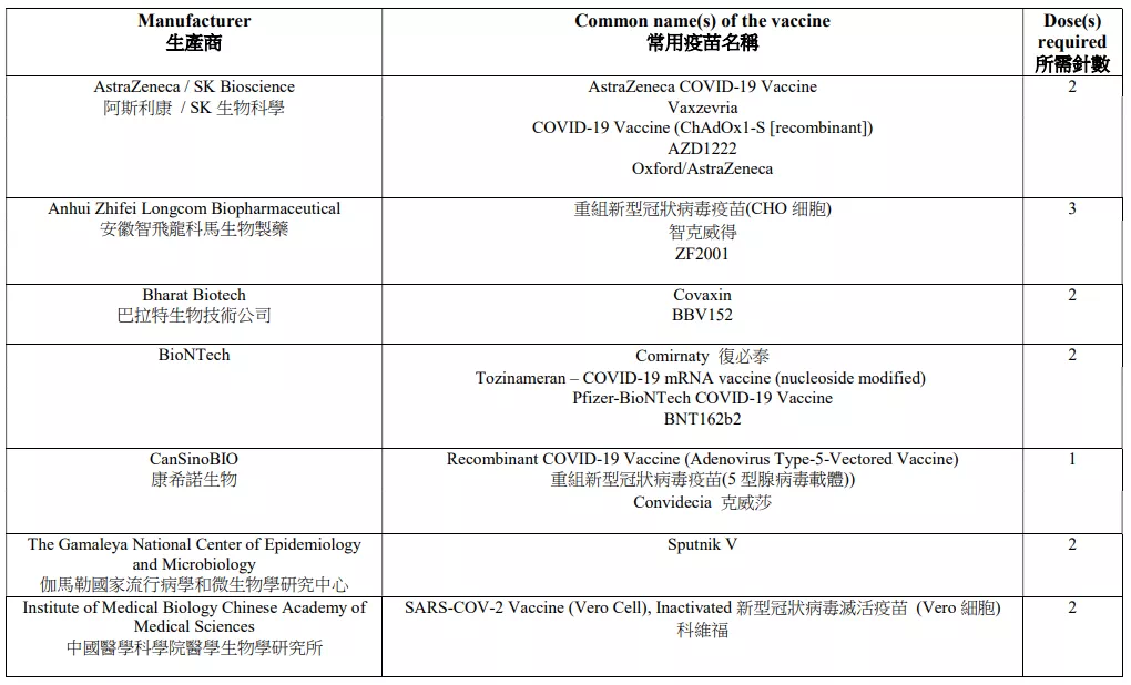 香港认可疫苗名单: