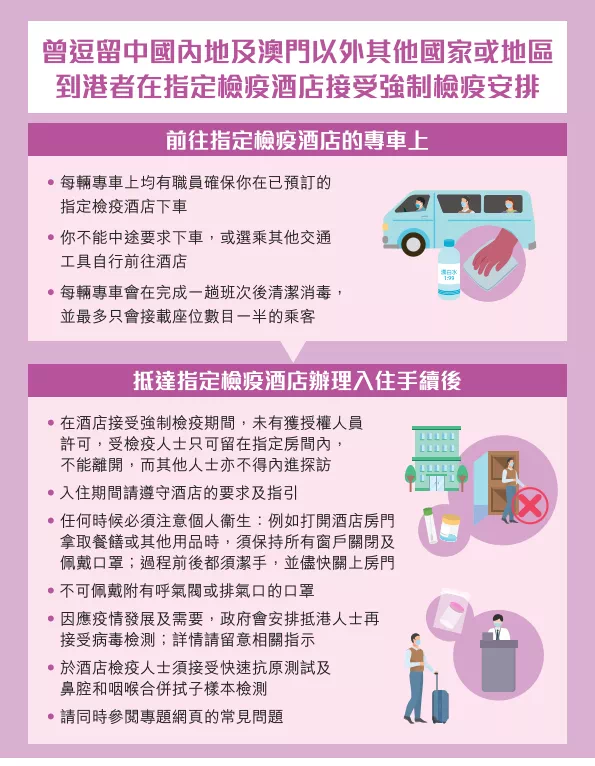 2.隔离7天从抵港当晚开始算起。如6.1 入境开始入住指定酒店隔离,6.1日当晚起数7晚,即6.7的23时59分解除隔离。期间不可以提前离开,必须等检疫期满卡点离开。