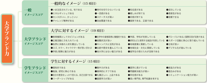 大学品牌形象调查主要从一般形象、大学品牌形象和学生形象三个方面的49个项目对大学进行评估。
