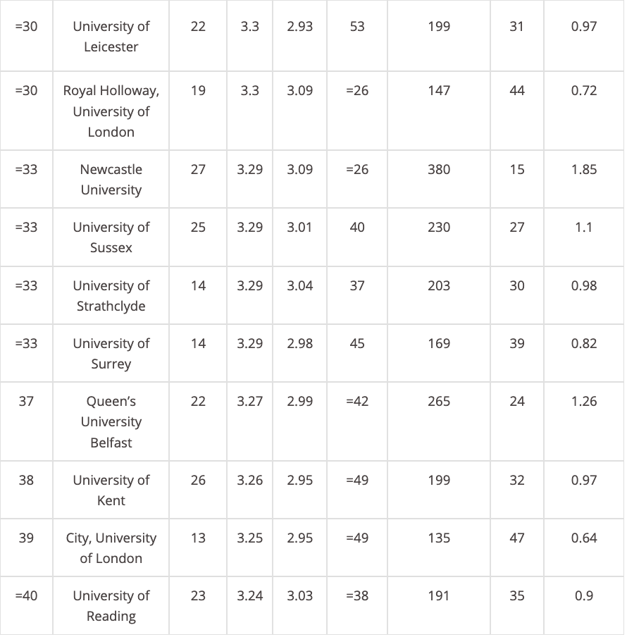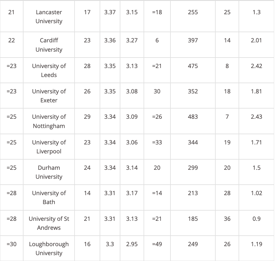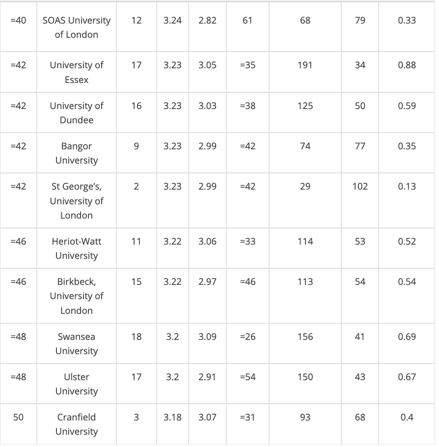 相对于research排名,GPA排名的参考度较高,因此我们也为大家列出了 GPA排名中的REF英国大学TOP50