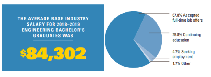 我们以工程学院为例,本科生的平均起薪为 $84302 ,有将近 68% 的学生找到了满意的工作,还有大约 26% 的毕业生选择继续深造。